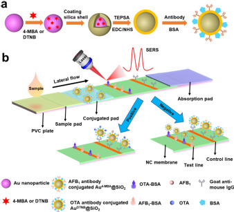 In practice, two kinds of Raman reporters 4-mercaptobenzoic acid (4-MBA), and 5,5'-dithiobis-(2-nitrobenzoic acid) (DTNB) encoded silica-encapsulated gold nanotags (Au4−MBA@SiO2 and AuDNTB@SiO2) were used as detection markers to identify the two different mycotoxins. Through systematic optimization of the experimental conditions, this biosensor has high sensitivity and multiplexing with the limits of detection (LODs)at 0.24 pg mL−1 for AFB1 and 0.37 pg mL−1 for OTA. These are far below the regulatory limits set by the European Commission.