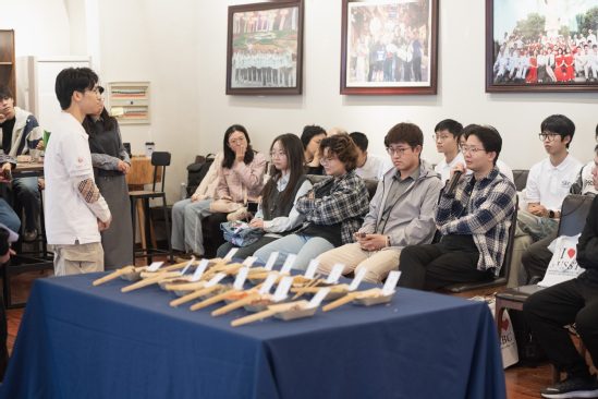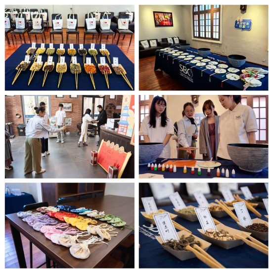 In the intangible cultural heritage hands-on zone, four traditional activities—lacquer fan painting, sachet crafting, ancient pitch-pot game, and paper cutting—unfolded simultaneously in a vibrant atmosphere. At the lacquer fan station, alumni created patterns blending the Shanghai Bund skyline with London's Tower Bridge using indigo, carmine, and gamboge hues. Before the sachet tables, participants carefully filled pouches with mugwort, clove, and cassia twigs, stitching personal regards and blessings into each creation. The pitch-pot area resonated with cheerful laughter, while the paper-cutting section displayed an array of exquisite works. The deep integration of campus cultural elements with traditional heritage skills created a dynamic interplay between artisan spirit and youthful energy.